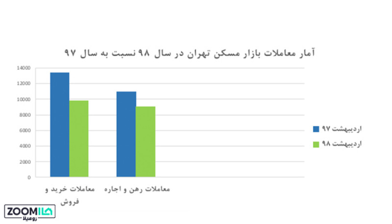 در شهر تهران برخلاف رونق نسبی معاملات مسکن در اسفندماه ۱۳۹۷ بازار اردیبهشت ماه ۹۸ همانند فروردین ماه کساد است. طبق آمار از نرخ معاملات مسکن تهران از یکم تا ۲۱ اردیبهشت ماه ۱۳۹۸ بالغ بر ۹۷۲۹ قرارداد خرید و فروش خانه در تهران امضا شده که نسبت به زمان مشابه سال قبل ۳۷ درصد کاهش یافته است. همچنین ۸۹۶۵ اجاره نامه در تهران به امضا رسیده که از کاهش ۲۲ درصدی قراردادها در بازار اجاره حکایت دارد.